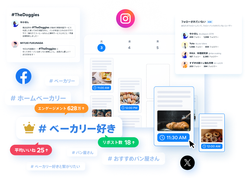 予約投稿やフォロー管理といった運用効率化ツール、フォロワー数やエンゲージメント率の分析ツールなどを通じて、SNSアカウント運用を強力にサポートします。